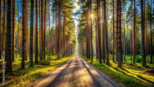 © Collection, Fototapeta premium Sunlit Pathway Through a Majestic Pine Forest, Casting Long Shadows on a Serene Dirt Road