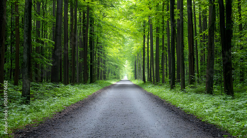 Fototapeta premium Sunlit Pathway Through Dense Green Forest Leading Towards Bright Horizon