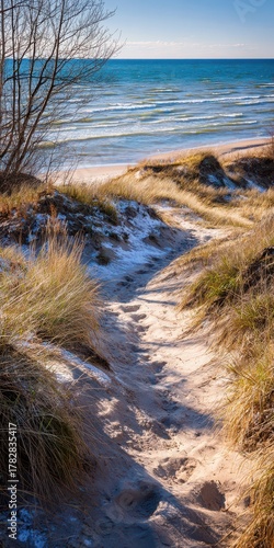 © Serhii, Fototapeta premium Sunlit Pathway Through Dunes Leading to Lake Michigan at Kohler Andrae State Park, Wisconsin