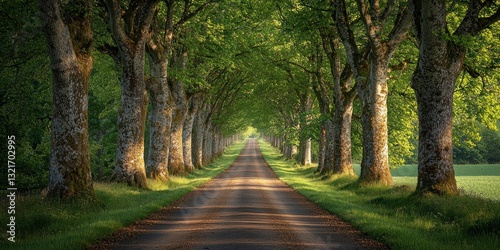 © Lens motion, Obraz premium Sunlit Pathway Through Majestic Trees