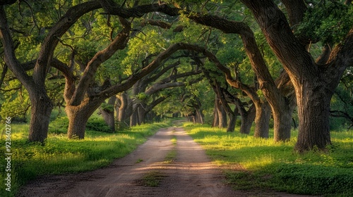Naklejka premium Sunlit pathway through tree-lined avenue during early morning in a lush green...