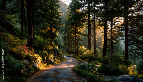 Obraz premium sunlit pathway through verdant forest canopy golden our illumination on windin road