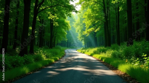 © Vibrant Visions Pixe, Fototapeta premium Sunlit Pathway Through Verdant Forest Canopy with Lush Green Undergrowth and Winding Asphalt Road