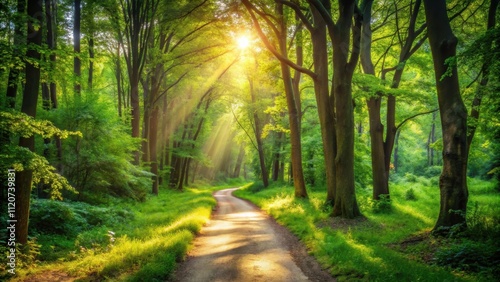 Naklejka premium Sunlit pathway winding through vibrant green forest, nature, sunlight,...