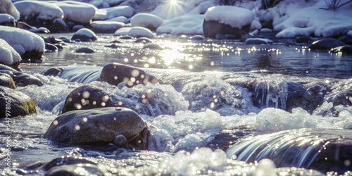 Fototapeta premium Sunlit pebbles glistening in a flowing stream.
