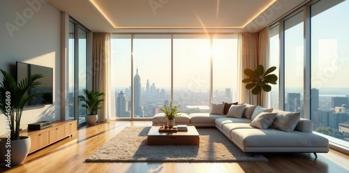 Fototapeta premium Sunlit penthouse living room, panoramic window, minimalist decor , luxury,...