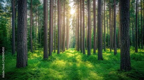 Obraz premium Sunlit Pine Forest Path: A sunbeam pierces the dense canopy of a pine forest, illuminating a path that winds through lush green undergrowth. The scene evokes tranquility and the serenity of nature.
