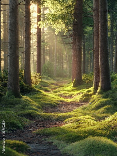 © Johannes, Obraz premium Sunlit pine forest path, mossy ground. Nature background image