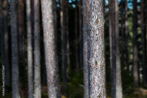 Fototapeta premium Sunlit pine tree trunk in the woods
