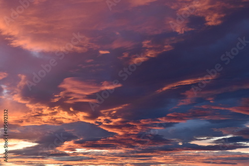Fototapeta premium Sunlit pink clouds, Sunset sky with pink clouds, spectacular sunset with colorful clouds