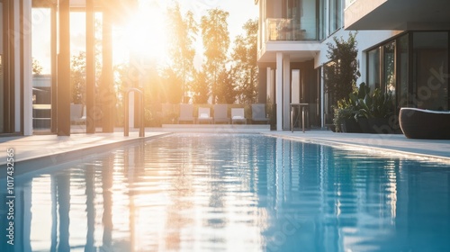 Fototapeta premium Sunlit pool area at a modern apartment complex with large clear windows,...