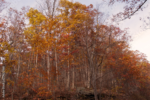 Fototapeta premium Sunlit pretty fall woods atop a hill