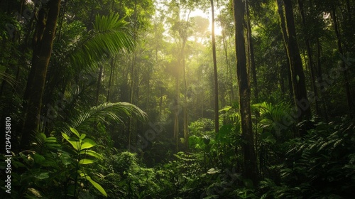 Fototapeta premium Sunlit Rainforest Canopy With Lush Green Vegetation