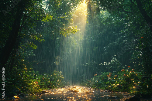 © Myartsam Design, Fototapeta premium Sunlit Rainforest Stream During A Gentle Rainfall