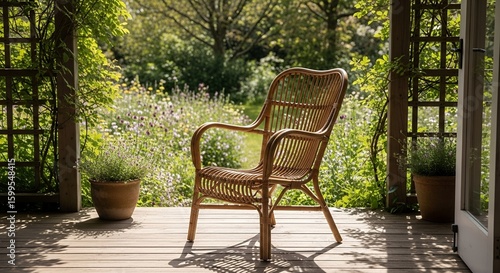 © NurUl, Obraz premium Sunlit Rattan Chair on Garden Patio Deck