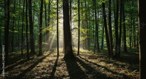 Obraz premium Sunlit rays pierce through tall trees in a lush forest, creating shadows on...