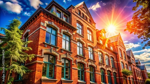 © prapatsorn, Fototapeta premium Sunlit Red Brick Duplex Building - Charming Architectural Detail Stock Photo
