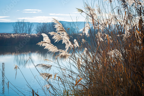 © Menyhert, Obraz premium Sunlit reed plumes on the banks of a river