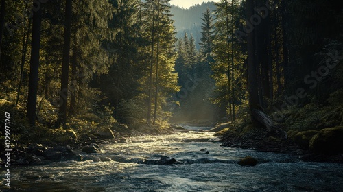 © Zeva, Obraz premium Sunlit river flowing through a mountain forest