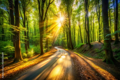 © Arethaawykoff, Obraz premium Sunlit Road Through Green Forest
