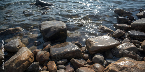 Fototapeta premium Sunlit Rocky Shoreline with Sparkling Water
