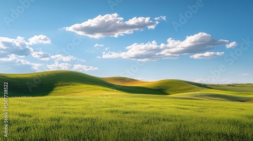 Obraz premium Sunlit Rolling Countryside with Clouds in Blue Sky