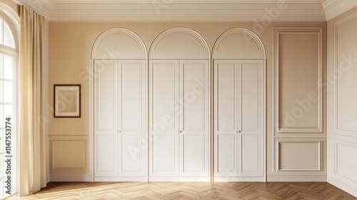 © azi, Fototapeta premium Sunlit room with arched alcove, white closet doors, and herringbone floor.