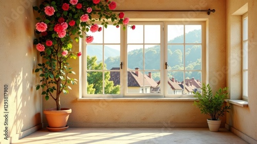© Bh_19, Fototapeta premium Sunlit Room with Blooming Rose and Verdant Plant in Pots by Window