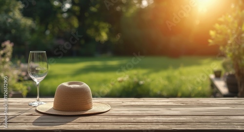 Naklejka premium Sunlit rustic wooden table with straw hat and white wine glasses plus expansive garden backdrop and copy space