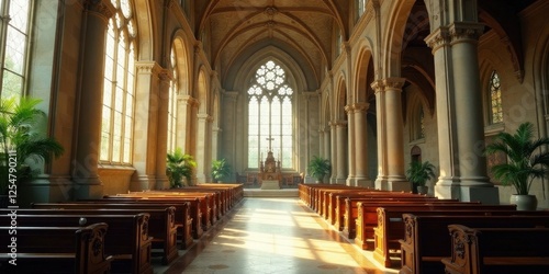 © Angel Pic, Fototapeta premium Sunlit Sanctuary Rows of Wooden Pews in a Tranquil Church with Tall Columns and Large Windows