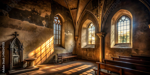 © Joesunt, Obraz premium Sunlit Sanctuary: Tranquil rays of sunlight illuminate a weathered chapel, highlighting the beauty of its architecture and evoking a sense of peace and reverence.