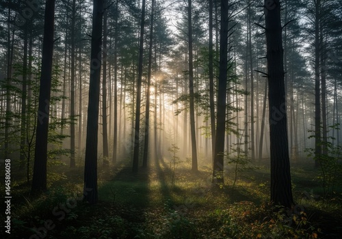 © Lavanya, Obraz premium Sunlit Serenity: Captivating Forest Scene with Trees Bathed in Golden Light