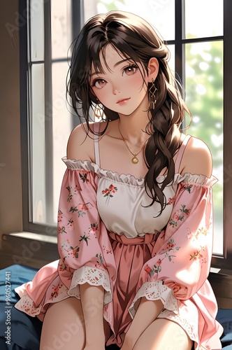 © Nethma, Fototapeta premium Sunlit Serenity: Reflecting in Soft Pastels - anime girl sitting in window