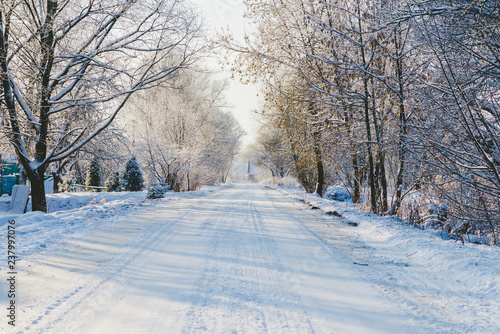 Obraz premium Sunlit snow covered winter road