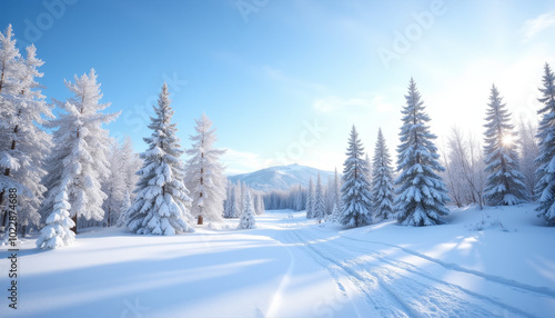 Naklejka premium Sunlit Snowy Landscape with Frosted Pine Trees