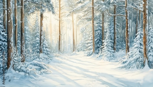 © Fitri, Fototapeta premium Sunlit snowy winter forest path.
