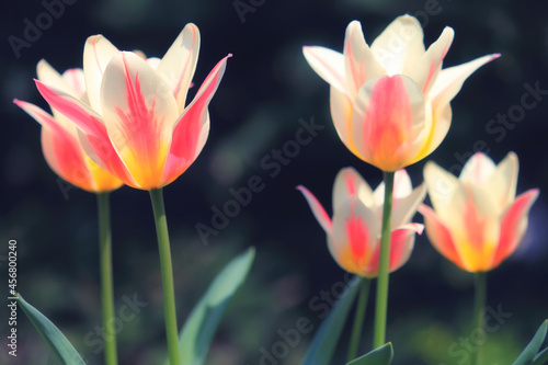 © DLVV, Fototapeta premium Sunlit soft focus pink and white Marilyn tulips on a dark background
