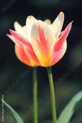 © DLVV, Fototapeta premium Sunlit soft focus pink and white Marilyn tulips on a dark background