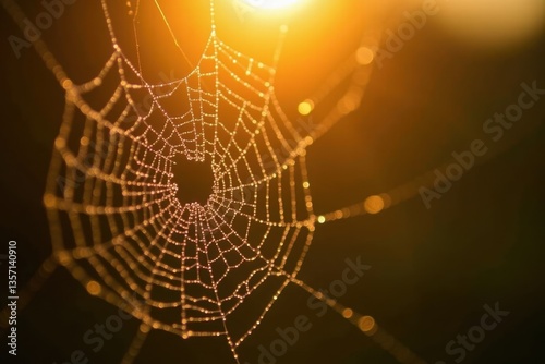 © volga, Fototapeta premium Sunlit spiderweb in autumn morning glow