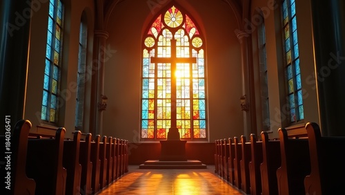 Fototapeta premium Sunlit stained glass cross window illuminating empty church interior with...
