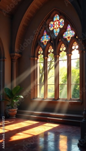 © Anya, Fototapeta premium Sunlit Stained Glass in Spiritual Retreat Peaceful Atmosphere of Contemplation and Inner Peace