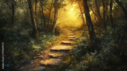 © Ali, Obraz premium Sunlit stone path through a forest.