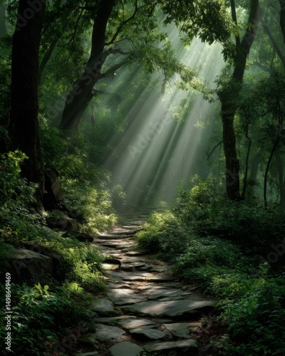 © Visioner, Obraz premium Sunlit Stone Path Through Lush Green Forest