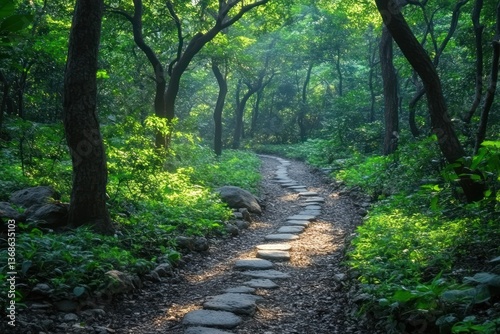 © Ali, Obraz premium Sunlit stone path winds through lush green forest.