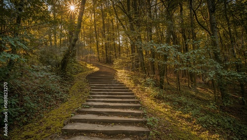 Obraz premium Sunlit stone pathway winding through a lush forest