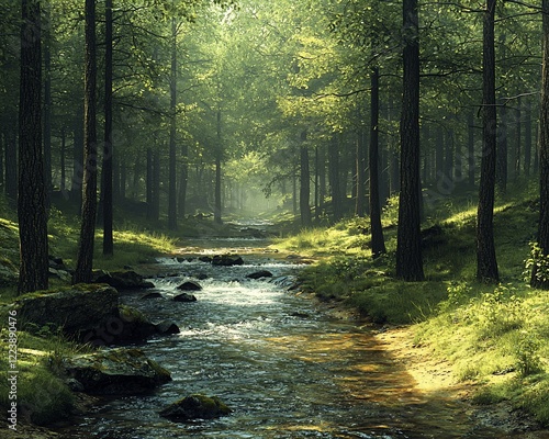 © ABIDZAR ALFAREZ, Obraz premium Sunlit stream flowing through a misty forest.