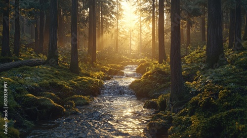 © harryaishi, Fototapeta premium Sunlit stream flowing through a misty forest.