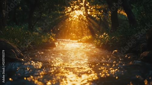 Naklejka premium Sunlit stream flowing through lush forest.