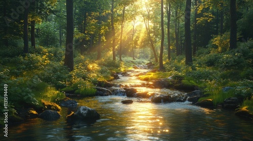 © Ali, Obraz premium Sunlit stream flows through a lush green forest.