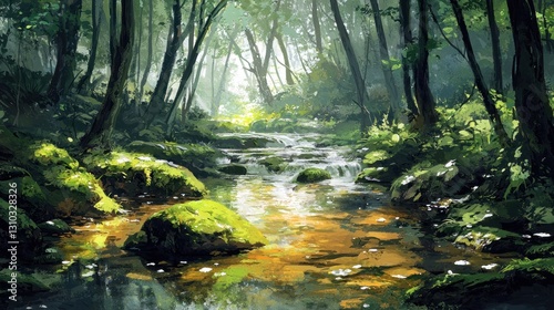 © harryaishi, Obraz premium Sunlit stream flows through a lush green forest.